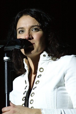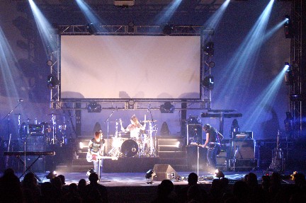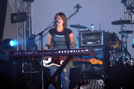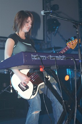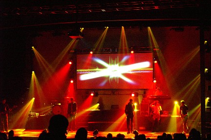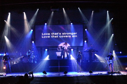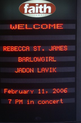 Rebecca St. James took the stage and she brought the whole crew! Two brothers accompanied her on stage and they even had one song just themselves. Another brother on lights did a great job, I would hate to think about all the time put in planning what light comes on when but it was just enough. Not overwhelming but enough to get you to say "cool" ( or nice, rad, neat or whatever you'd say these days). Mom and Dad were in the background (not singing background) keeping things hopping. Dad managing and Mom helping with the merchandise or wherever was needed. And talked with little sis, she helped me with working with another MAC computer. What is it, all these artists using MACs? Most of the family has a part in helping Rebecca on the road.